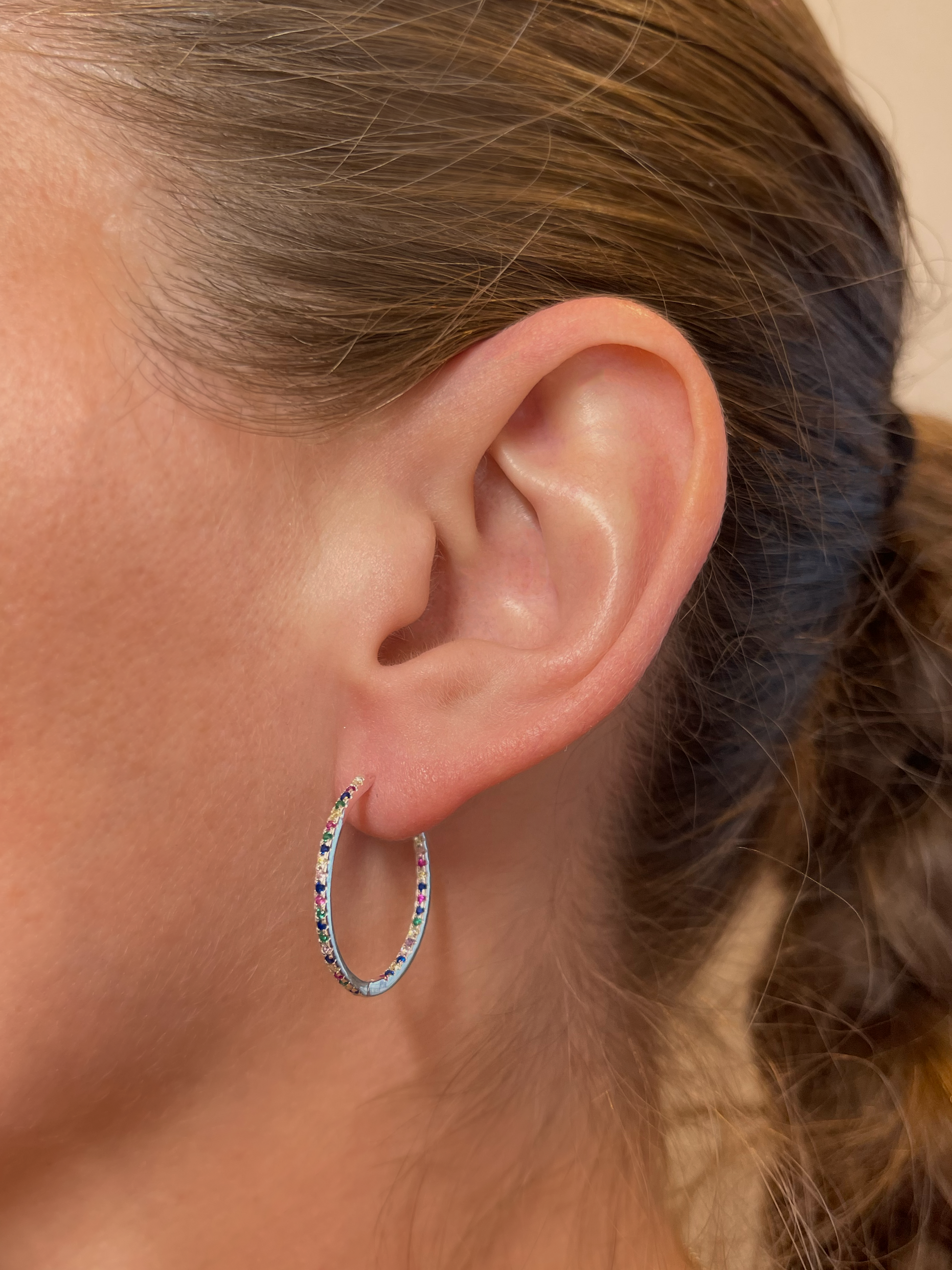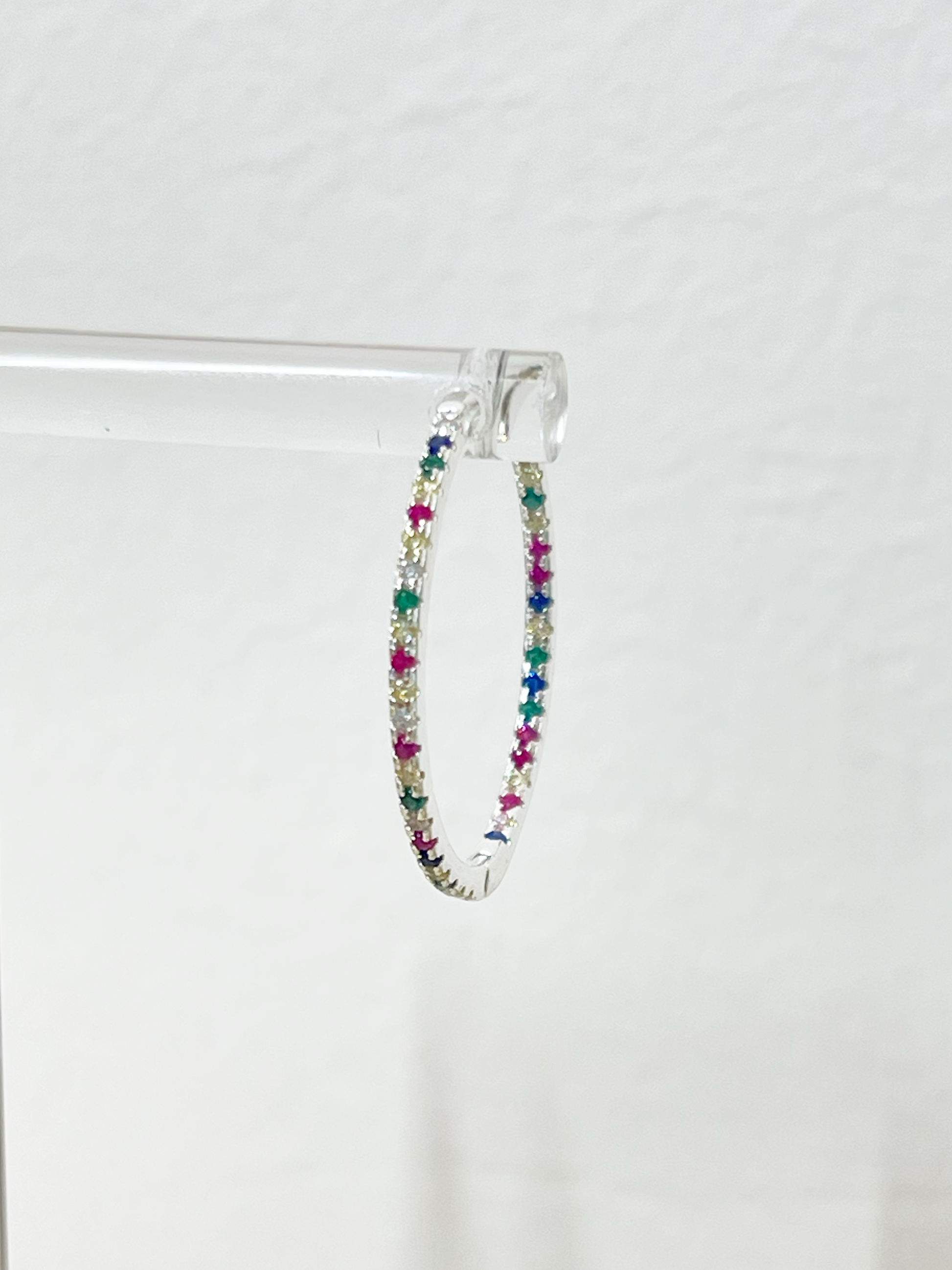 Estas argollas de cierre fácil ultra livianas están diseñadas en Plata 925 con circones de colores, y miden 23 milímetros de diámetro.