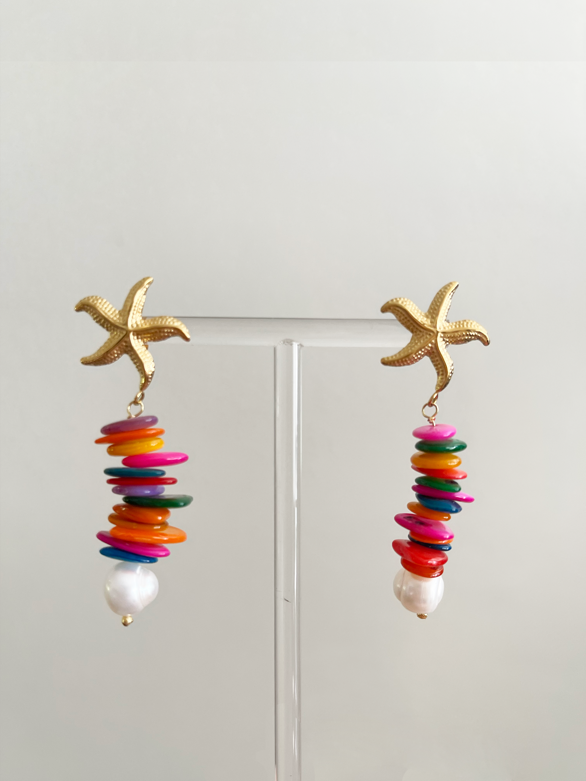 Están diseñados con una estrella en baño de oro 18k y nácar teñido de colores, junto a una perla de río natural. Formato ultra liviano.
