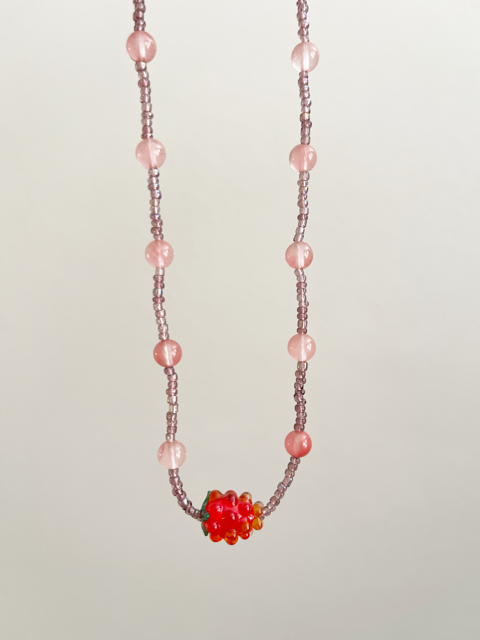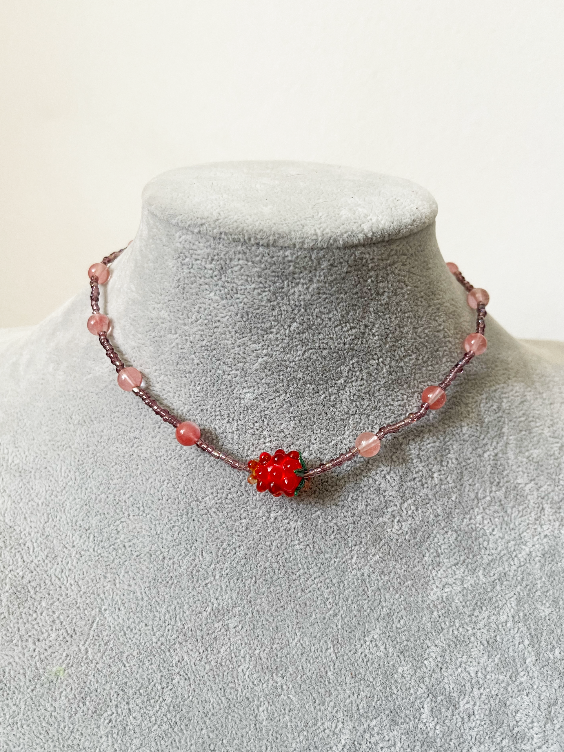 Este colgante está diseñado con mostacillas reutilizadas, cuarzo rosa y un dijes en forma de frambuesa de vidrio de murano. Mide 33cm y cuenta con una cadena de alargue de 5cm.