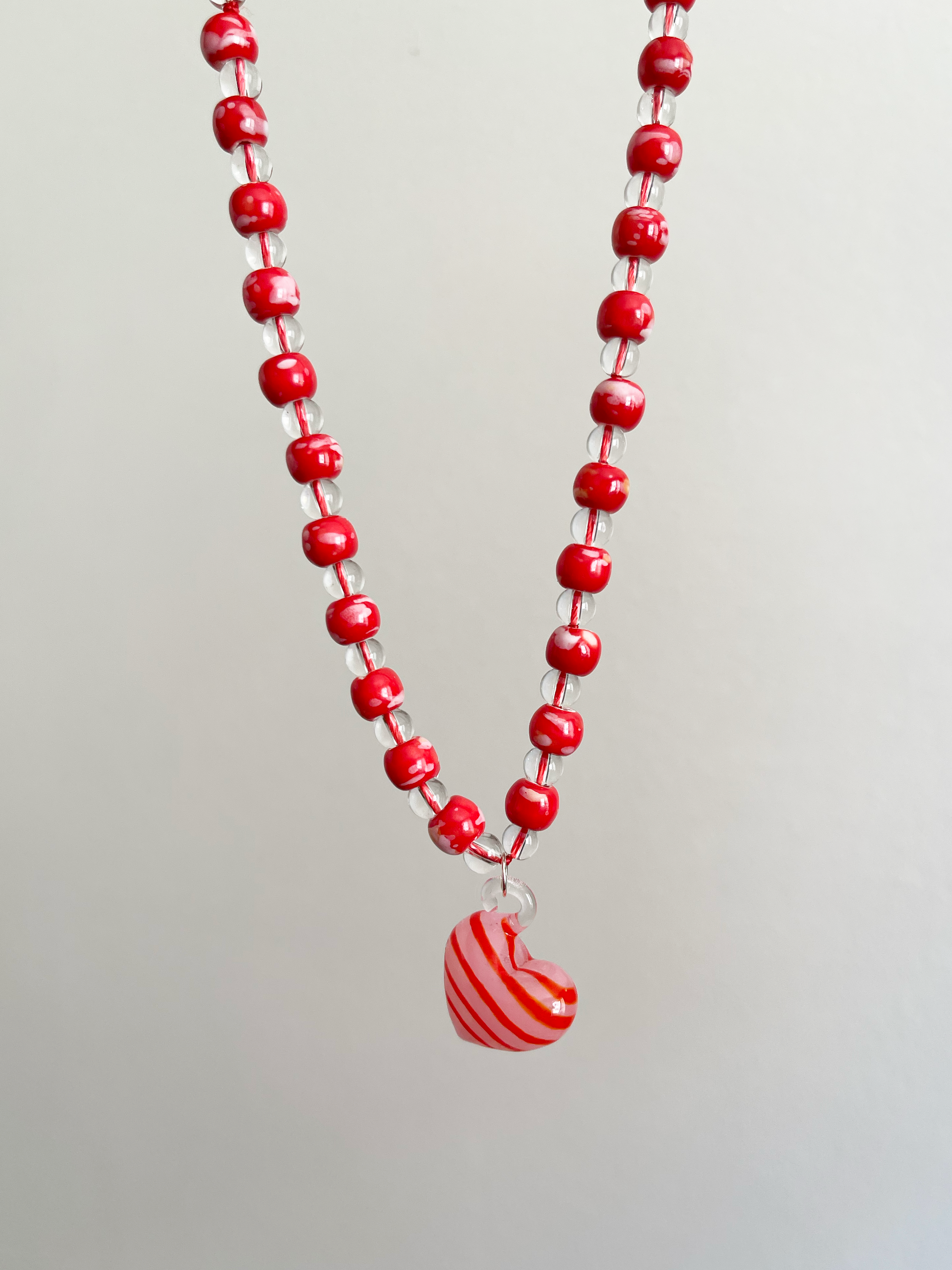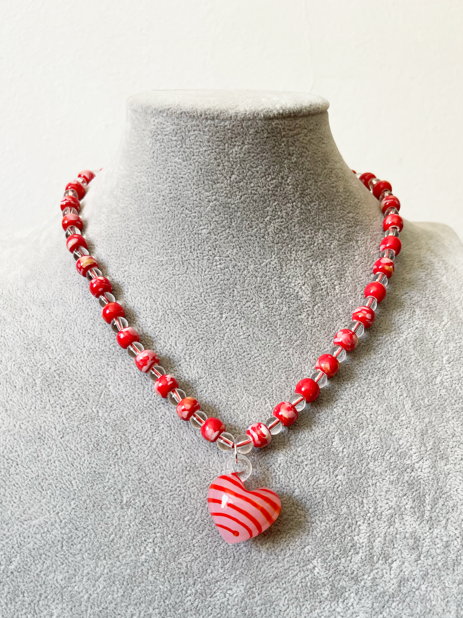 Este colgante está diseñado con cuentas de cerámica rojas, esferas de cuarzo cristal y un dije de corazón en vidrio de Murano. Mide 45cm y tiene cadena de extensión de 4 cm adicionales. Terminaciones en baño de plata, con hilo anudado tipo collar de perlas para mayor durabilidad y resistencia.