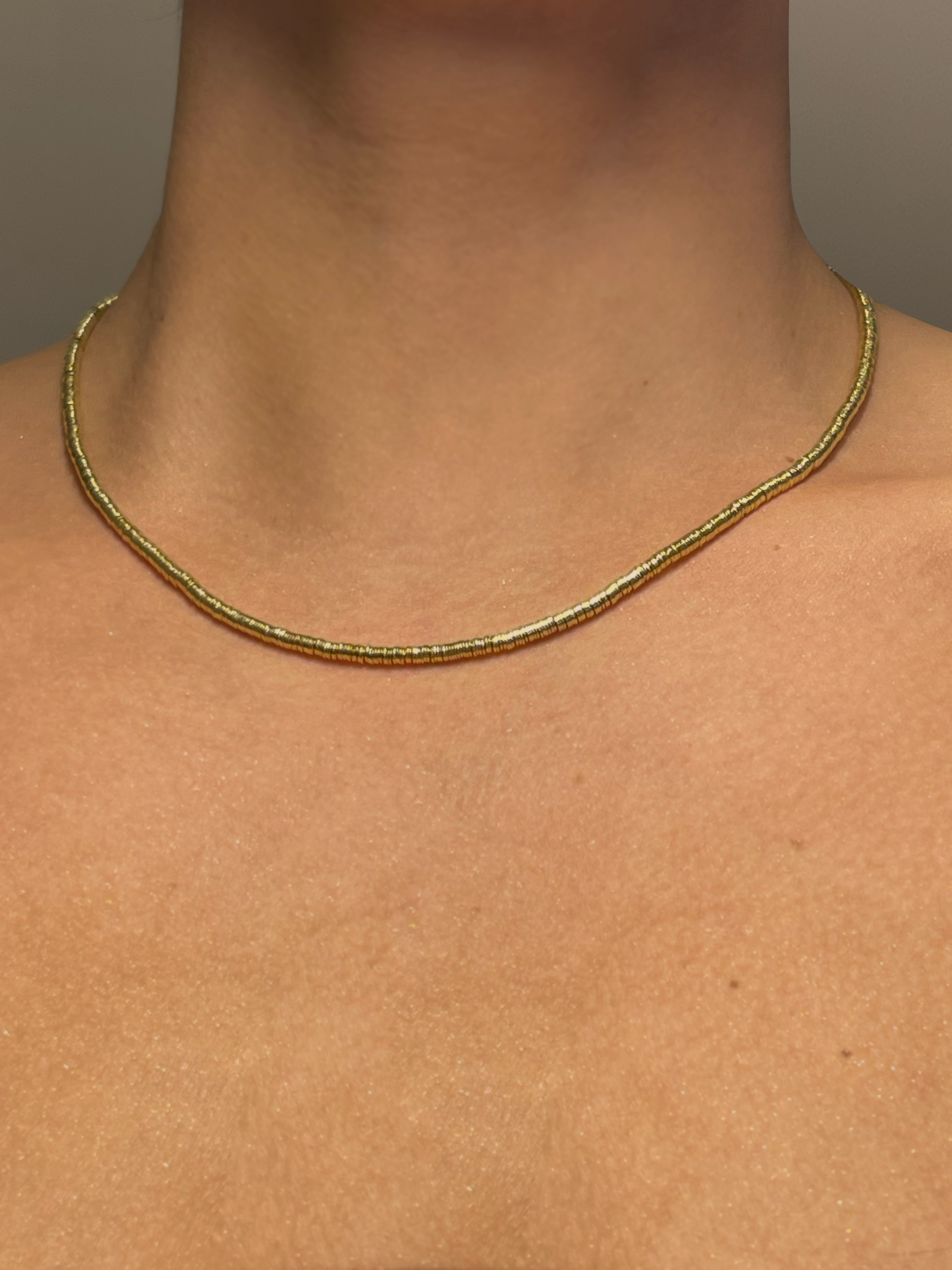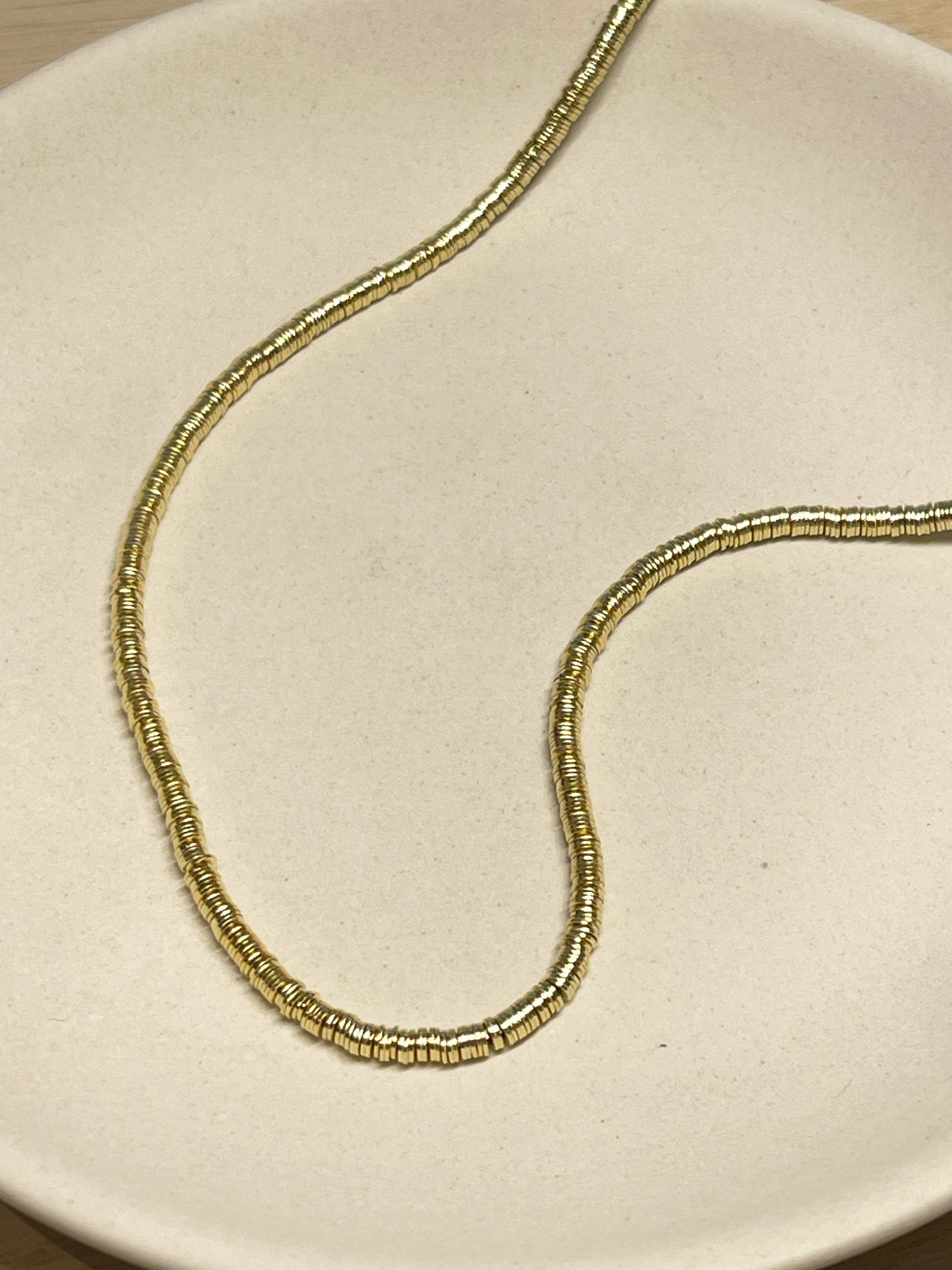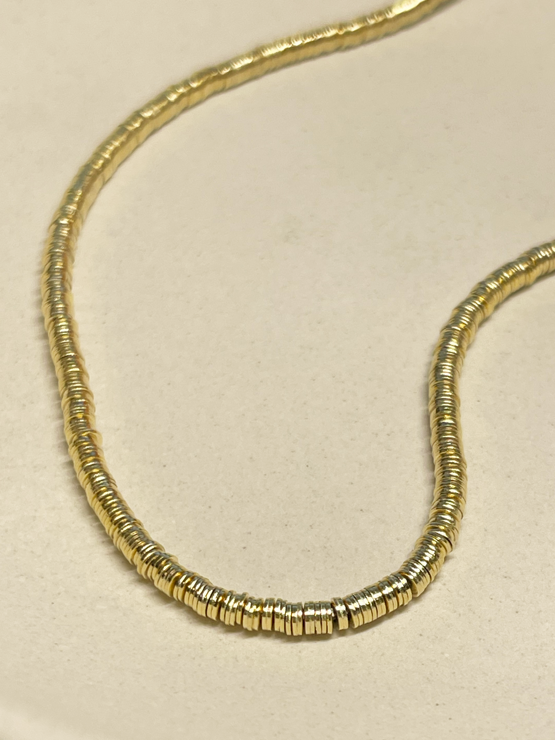 Cadena hecha con cuentas planas en Baño de Oro 18k de 40 centímetros de largo, con alargue.