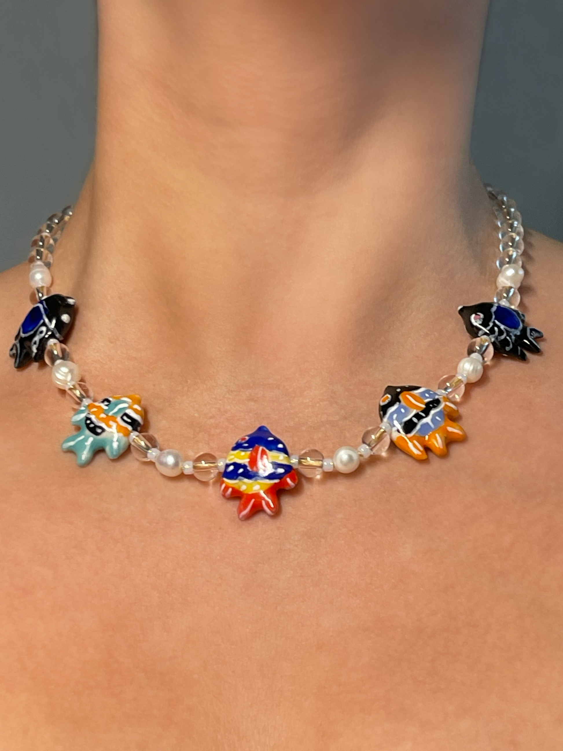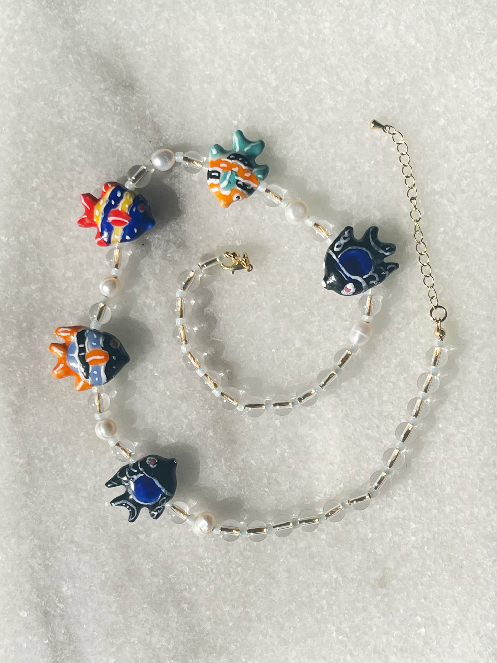 Está diseñado con esferas de cuarzo cristal, perlas naturales, mostacillas miyuki y peces de cerámica de colores hechos a mano, enhebrados en hilo anudado muy resistente. Terminaciones en baño de oro 18k. Mide 43 centímetros y cuenta con una cadena de alargue de 5 centímetros.