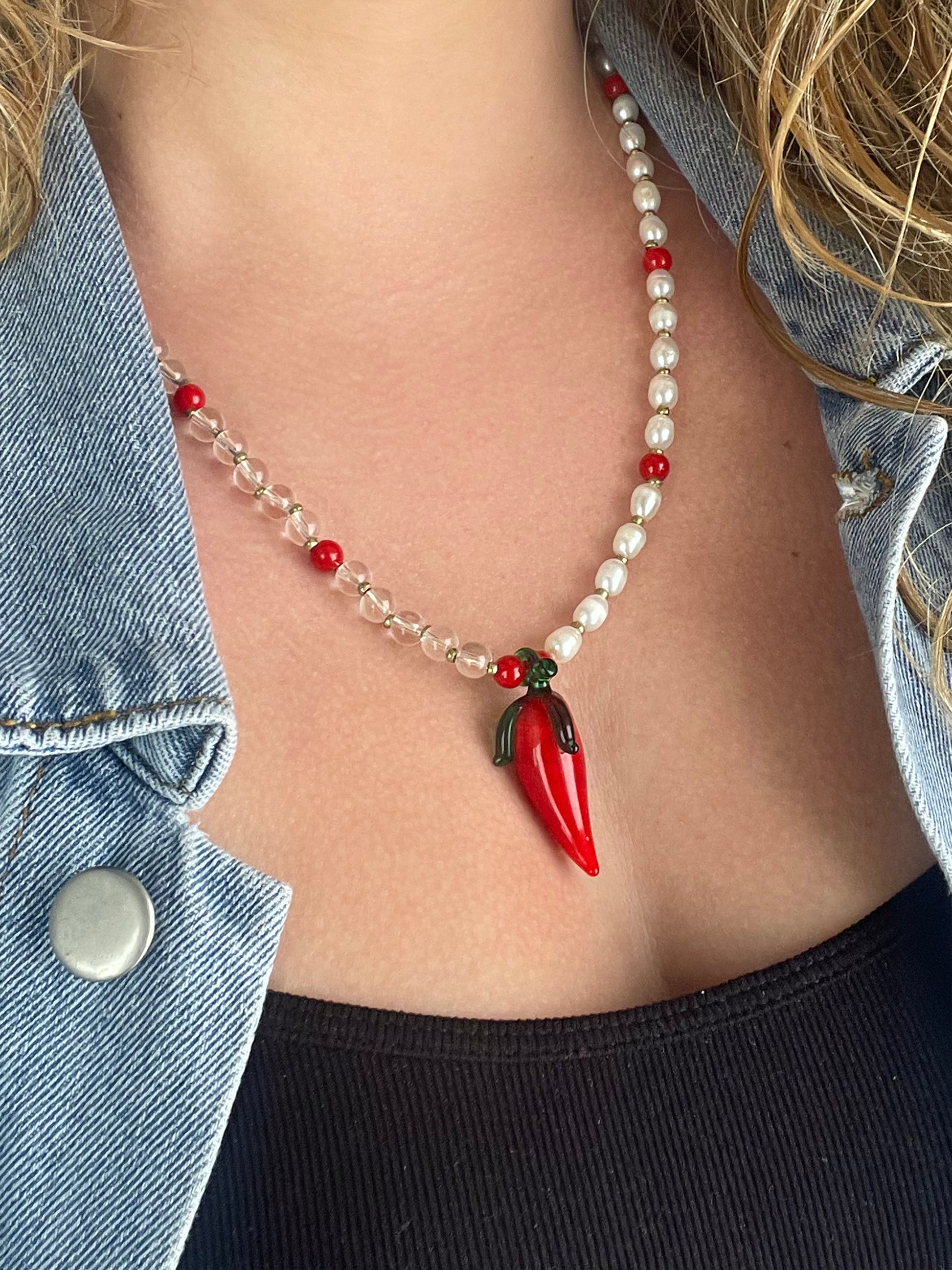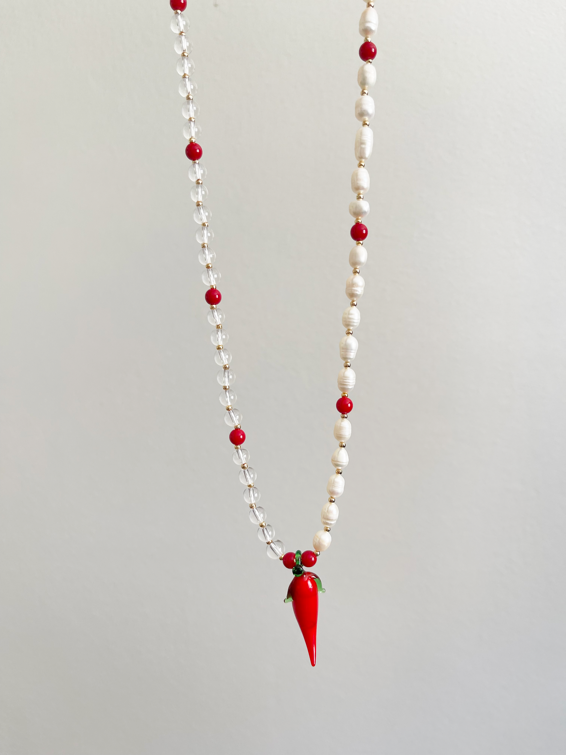 Este colgante está diseñado con perlas de río, esferas de cuarzo cristal, jade rojo y un dije en forma de ají de vidrio de Murano.