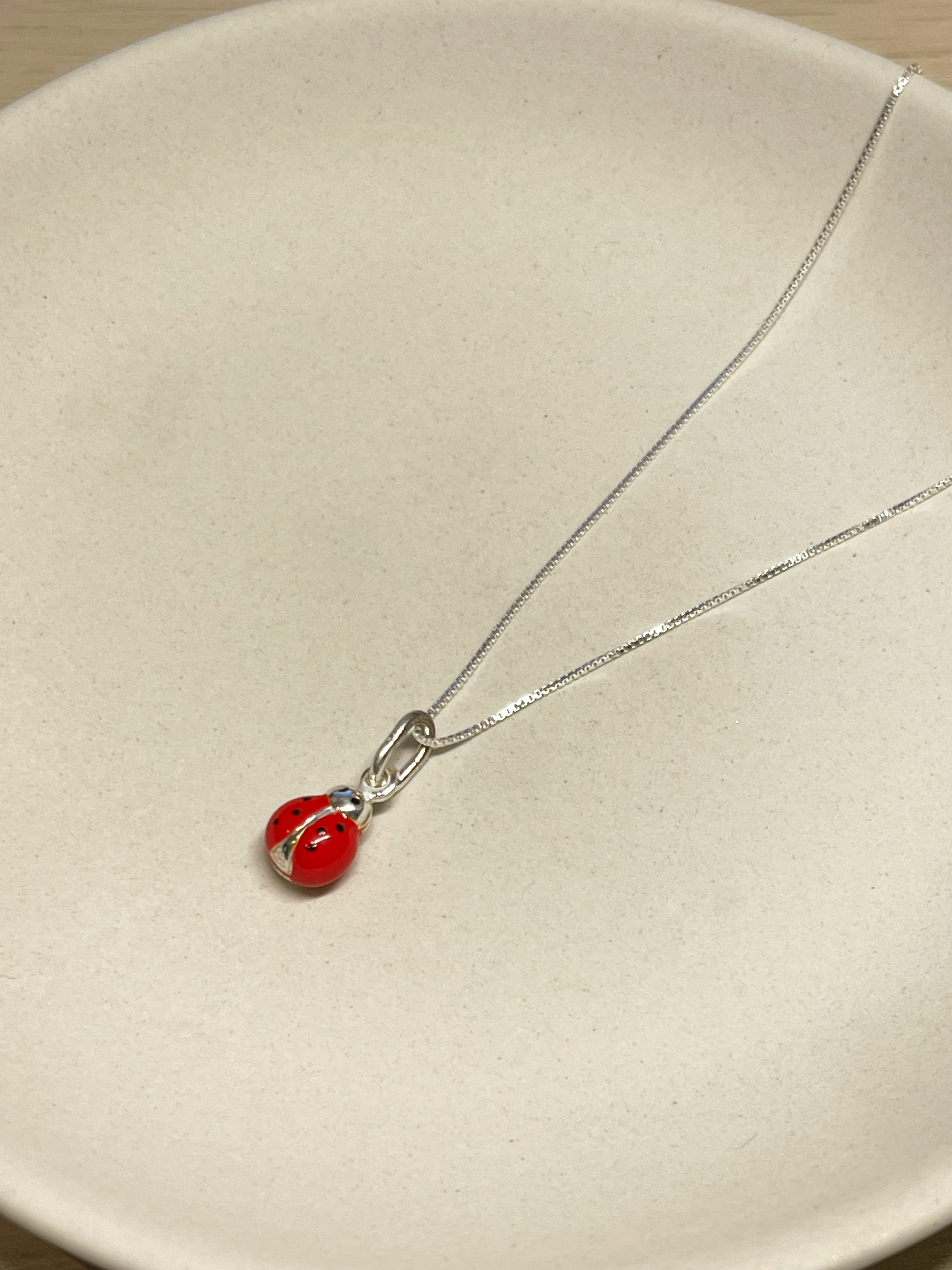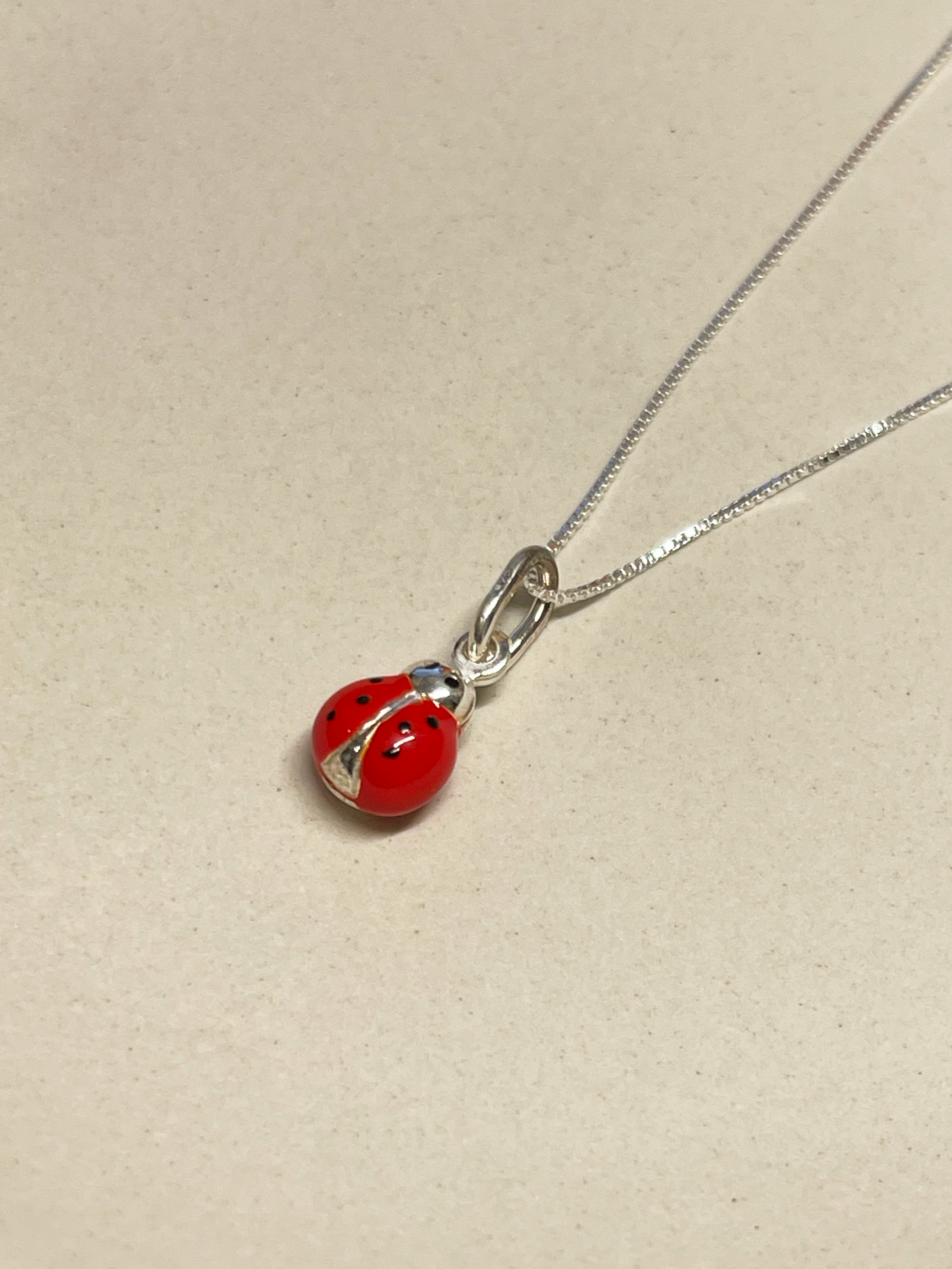 Collar con dije de chinita en Plata 925 esmaltada de 1 centímetro, hecha en Italia, con cadena en Plata 925 de 45 centímetros de largo sin alargue.