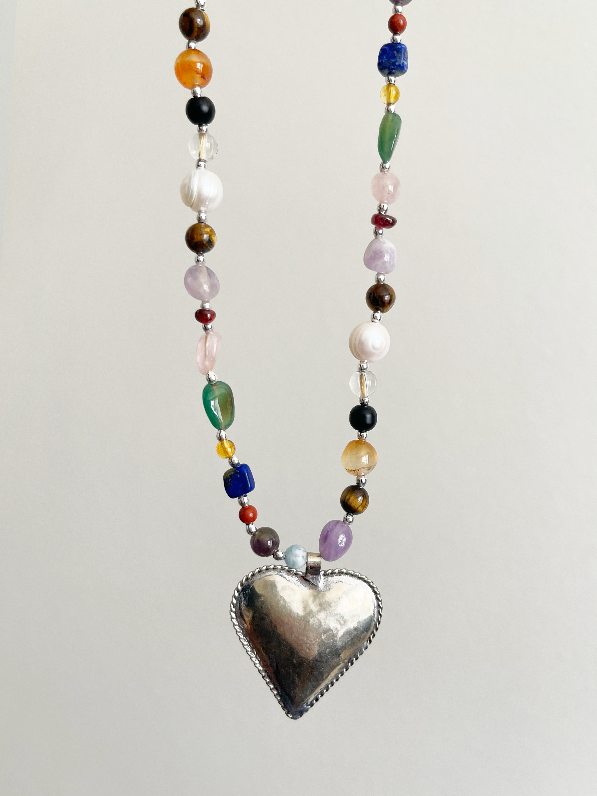 Este colgante ÚNICO está diseñado en base a piedras naturales como ágata, cuarzo rosado, cuarzo, amatista, aventurina, perlas, ónix, lapislázuli, granate, citrino, agua marina, entre otras, con un dije de latón hecho en Marruecos. Mide 46cm y tiene cadena de extensión de 4 cm adicionales. Todas las terminaciones son en baño de plata.