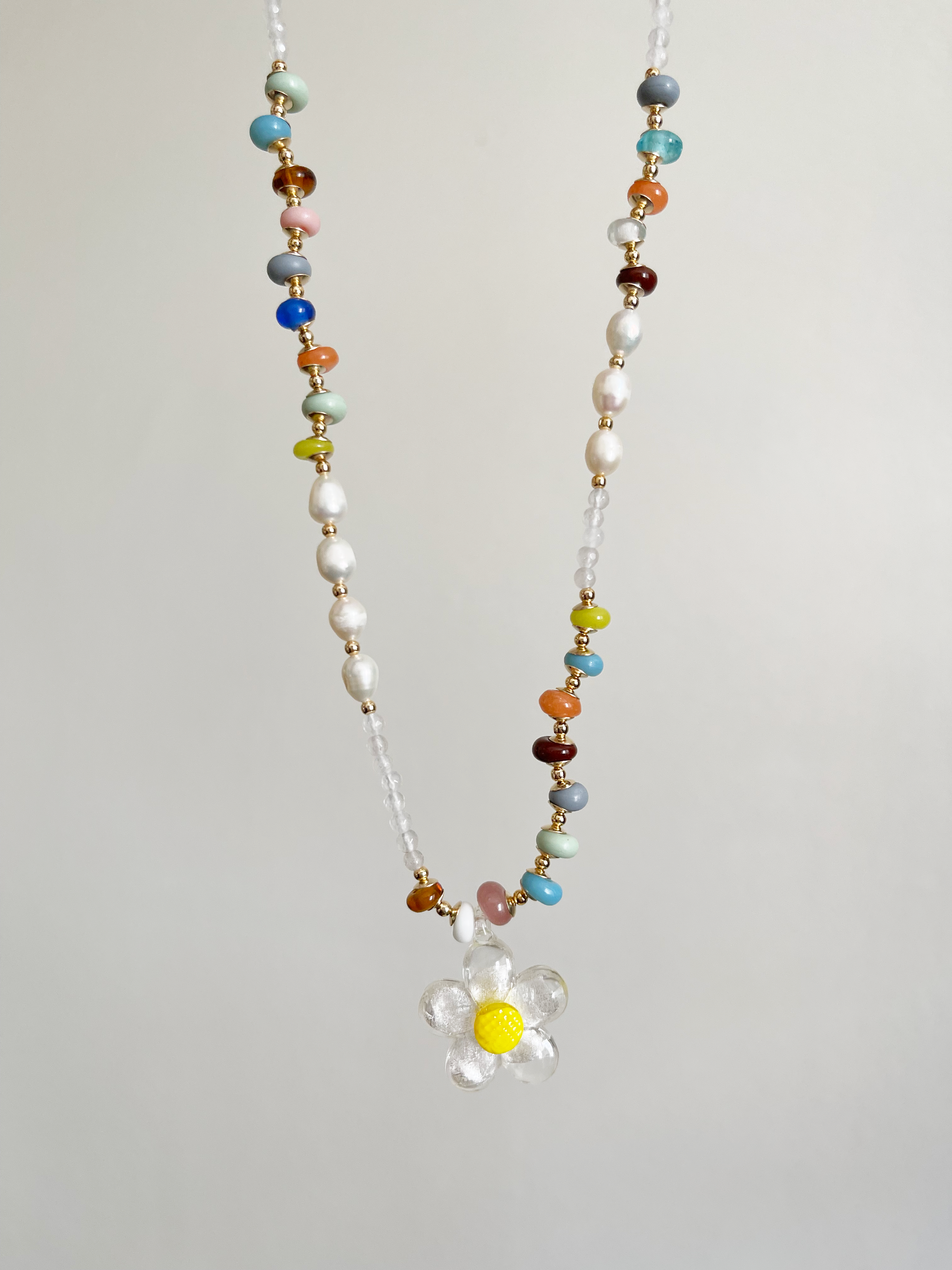 Diseñado con mostacillas de vidrio hechas a mano en Indonesia, perlas de río, piedra luna y un dije en forma de flor de vidrio de murano.