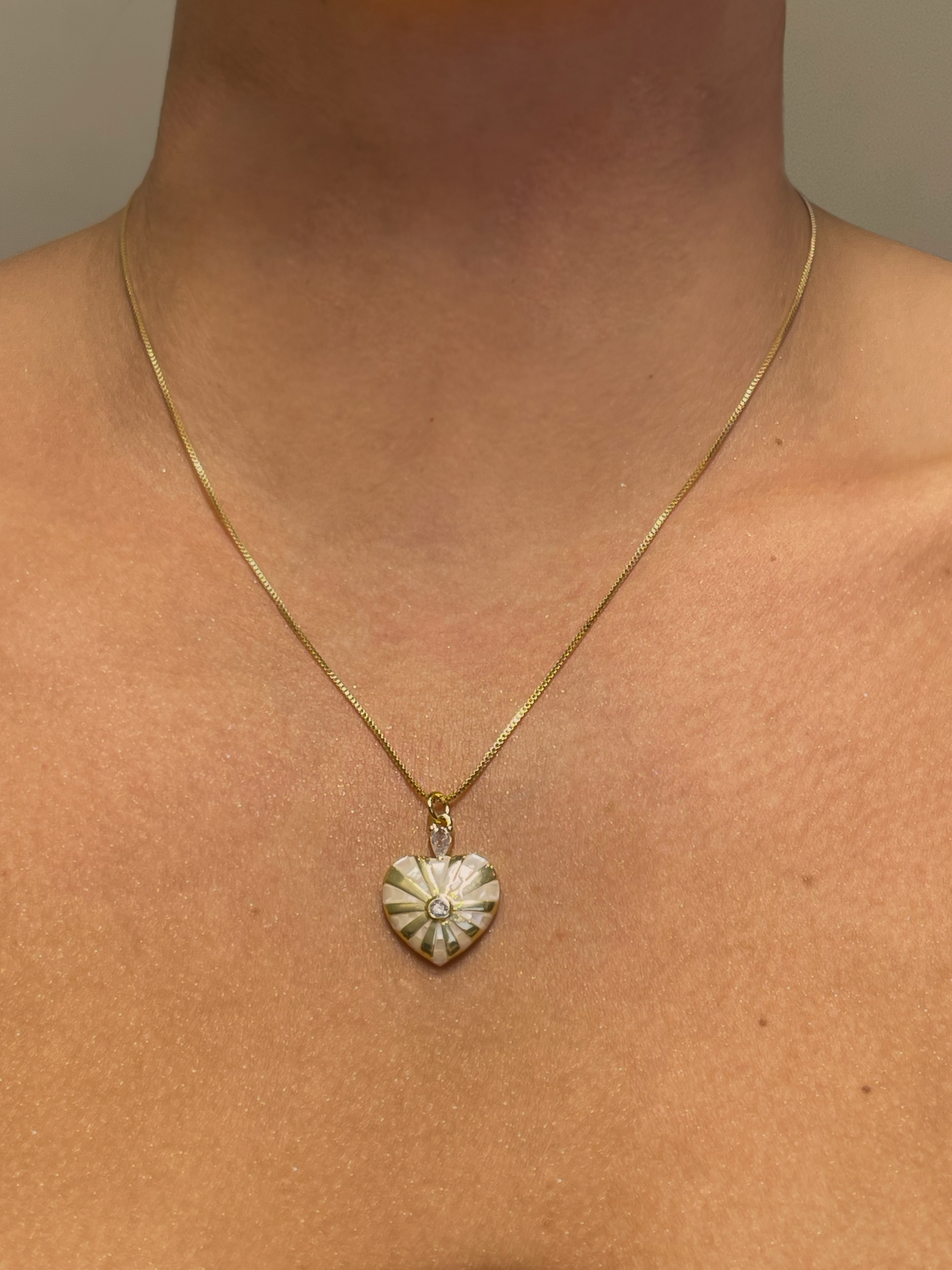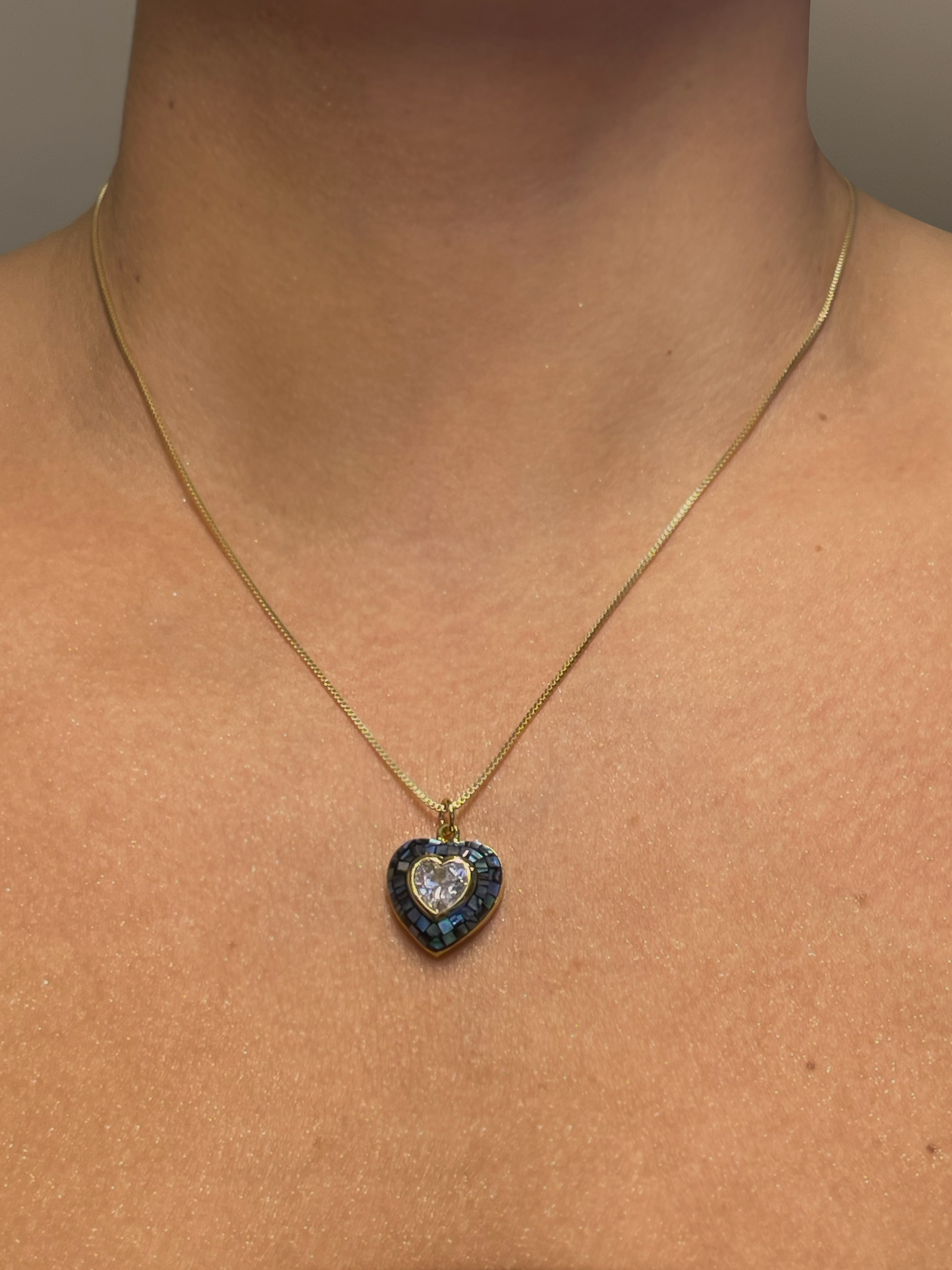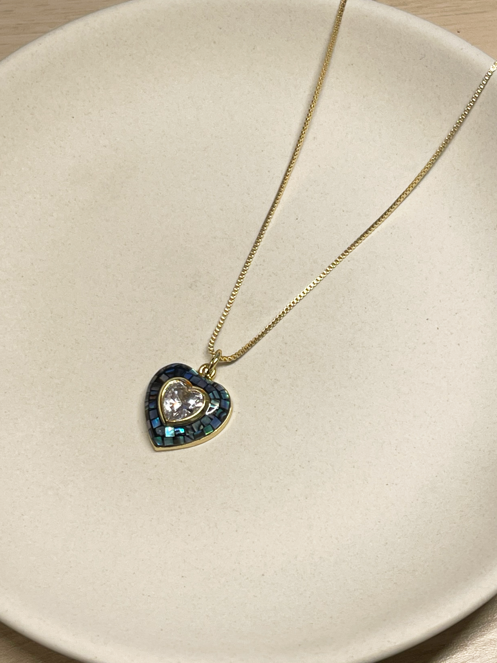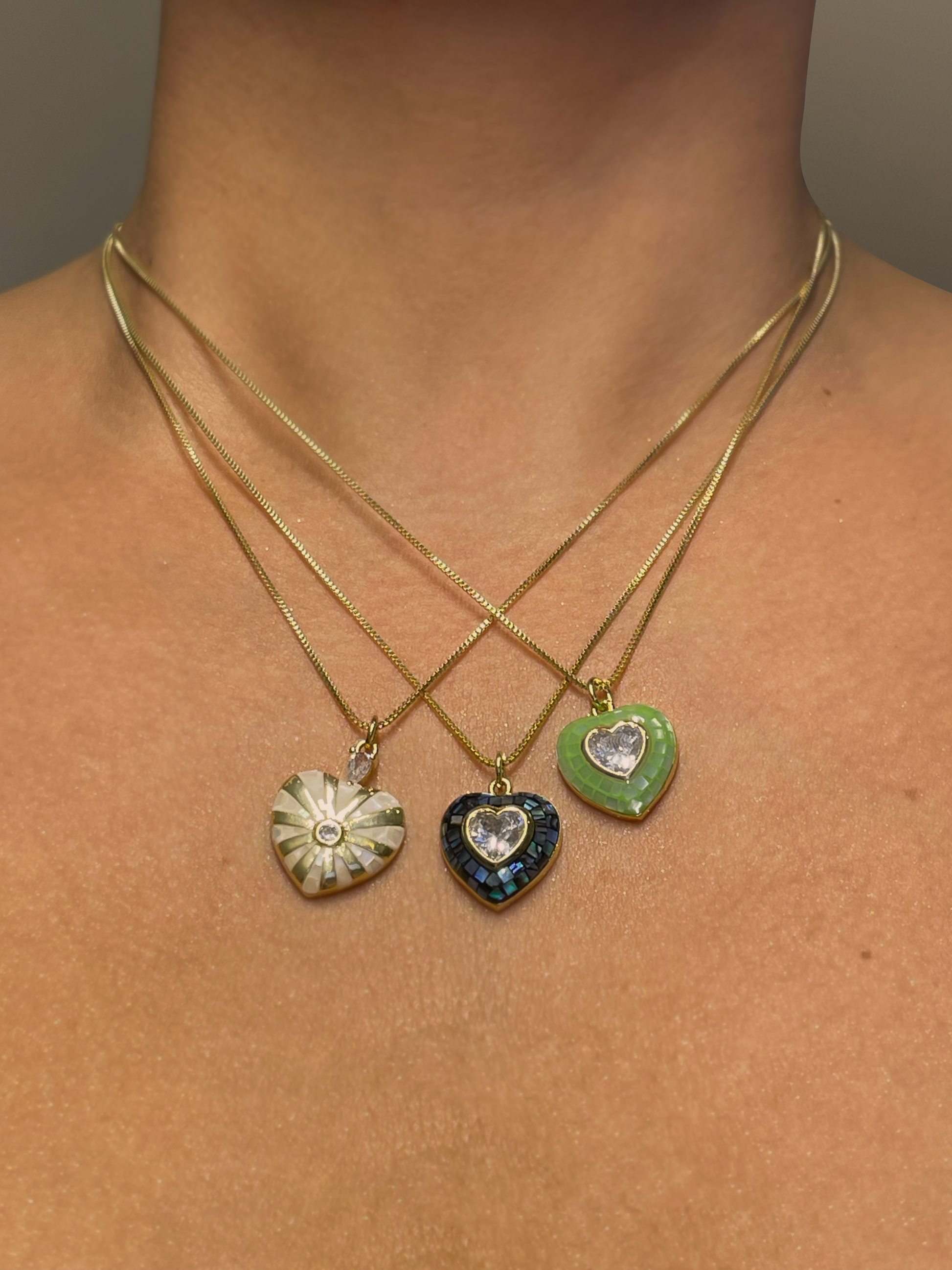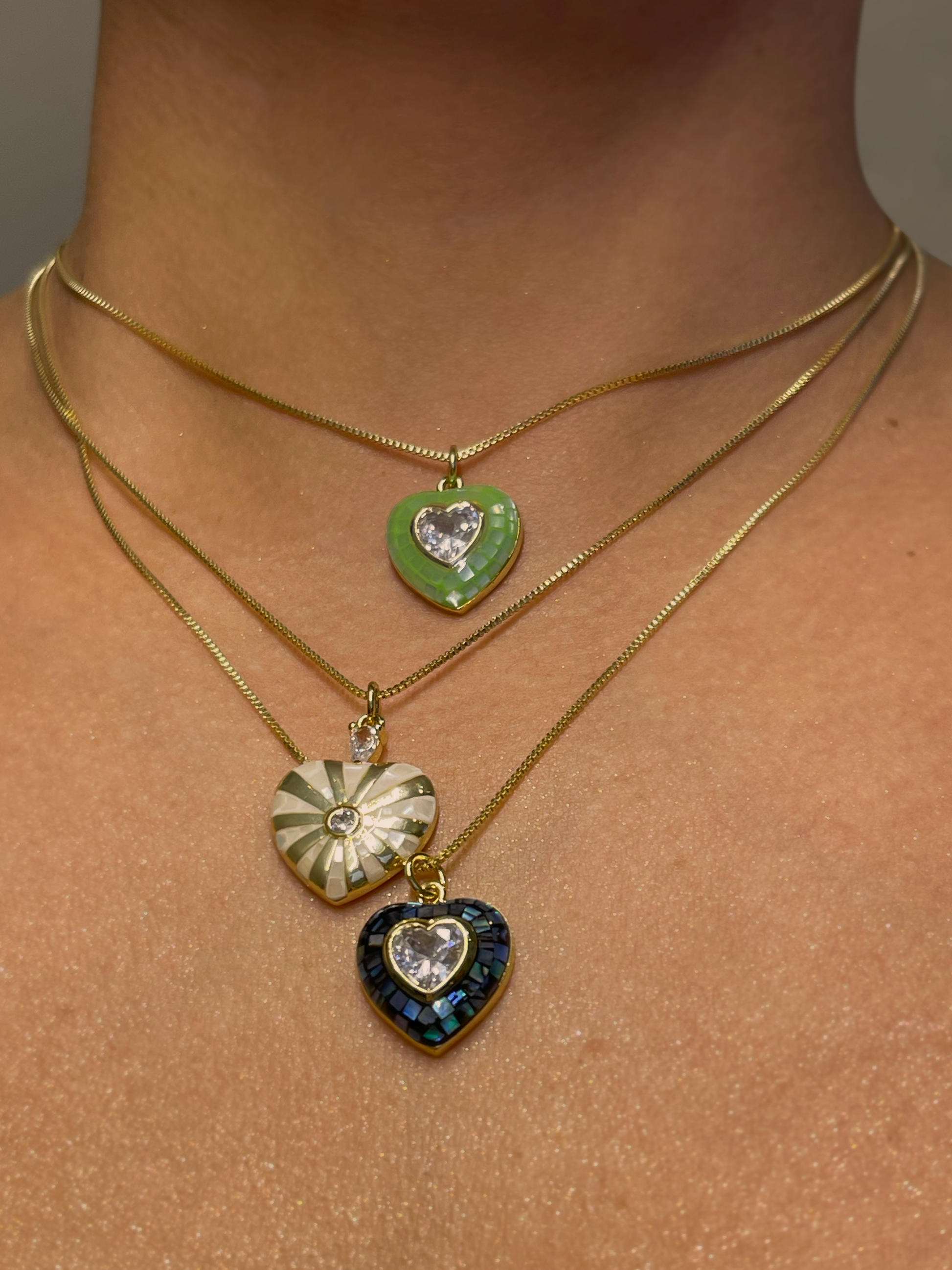 Collar con dije de corazón en nácar azul oscuro (Noir), crema (Creme) o verde (Green) con circones de 2,5 centímetros en Baño de Oro 18k, de 45 centímetros de largo sin alargue.