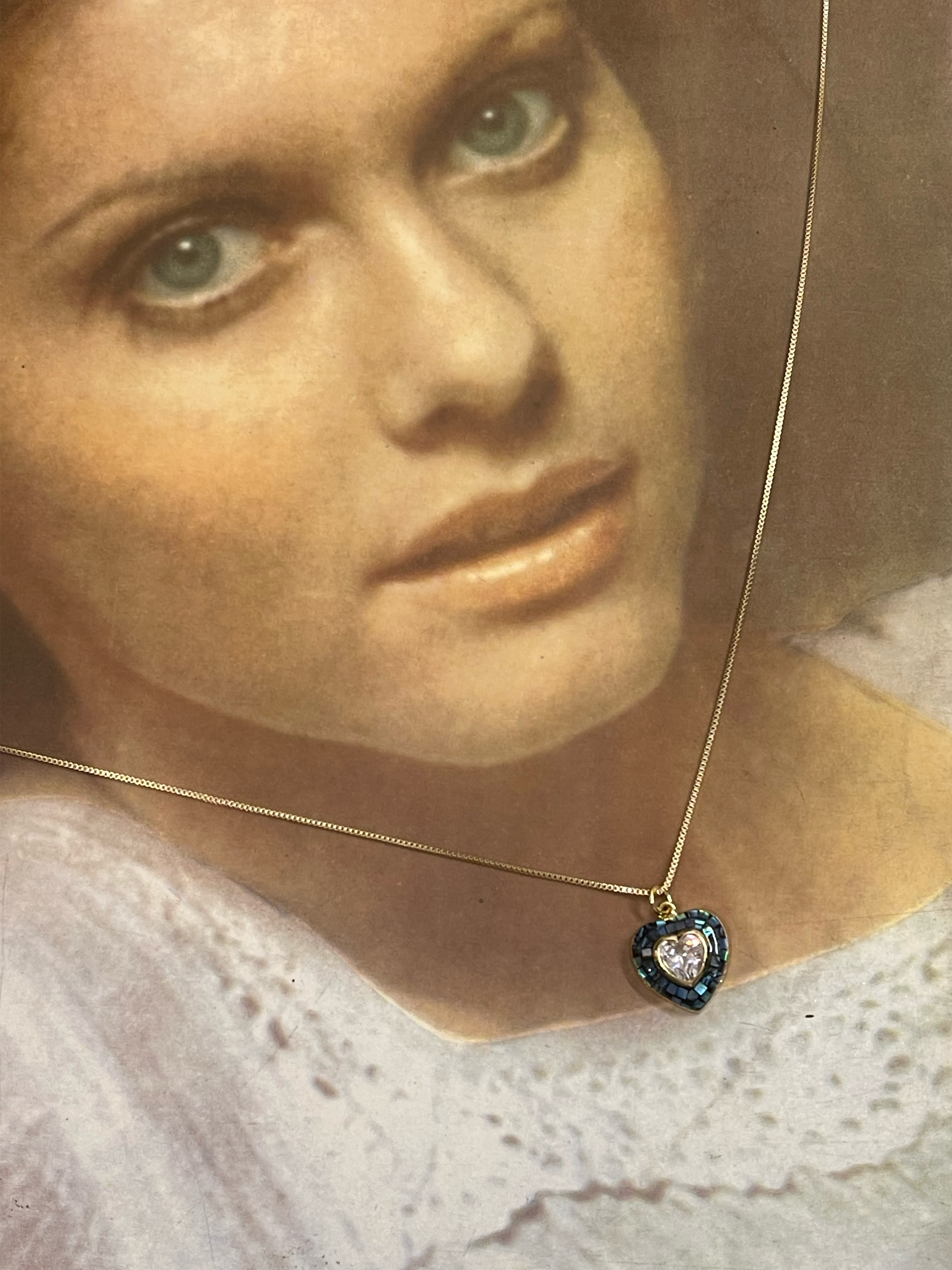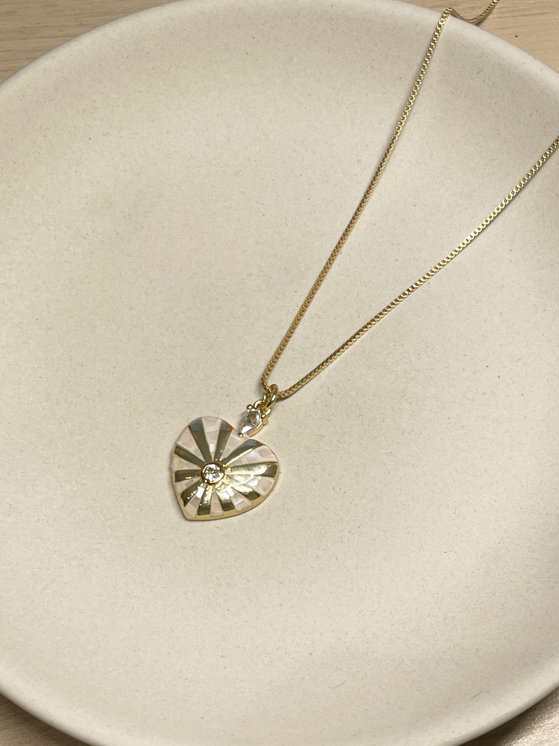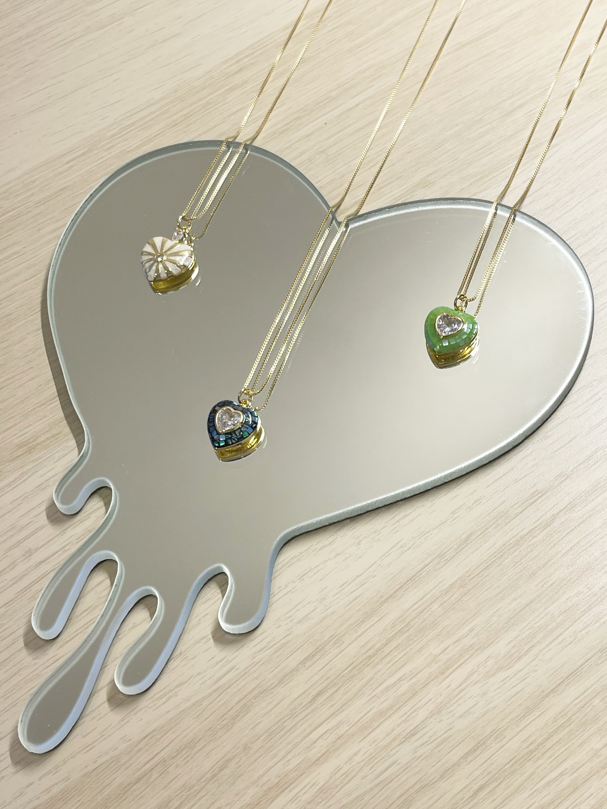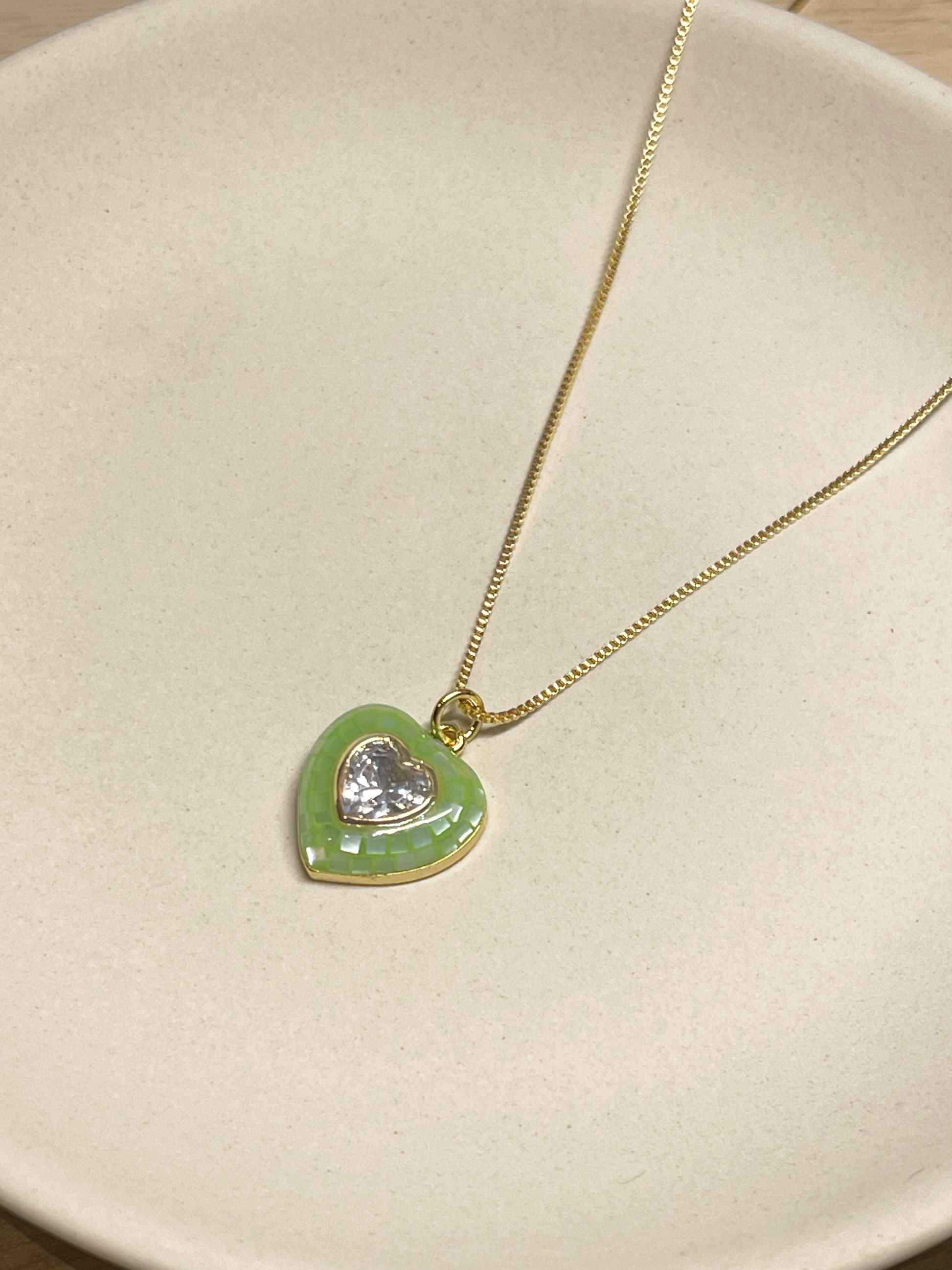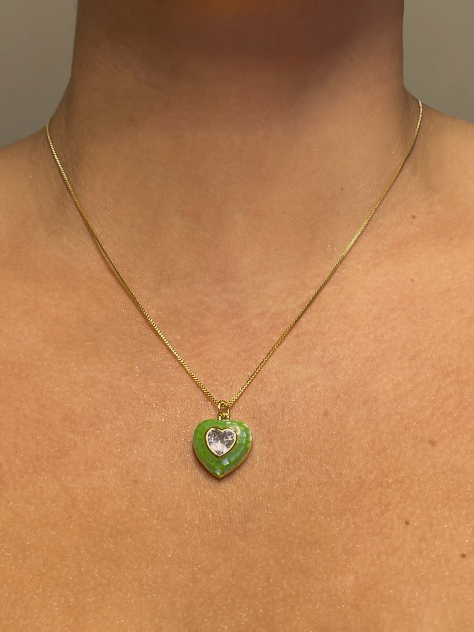 Collar con dije de corazón en nácar azul oscuro (Noir), crema (Creme) o verde (Green) con circones de 2,5 centímetros en Baño de Oro 18k, de 45 centímetros de largo sin alargue.